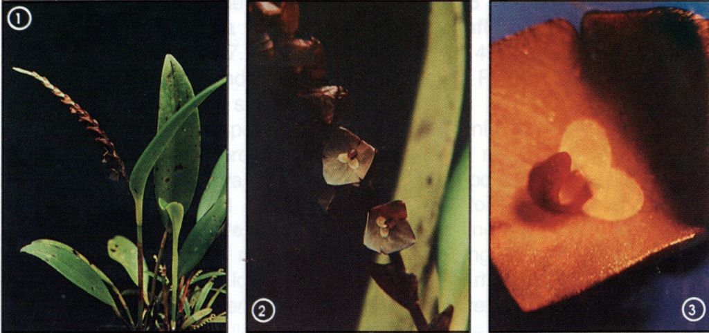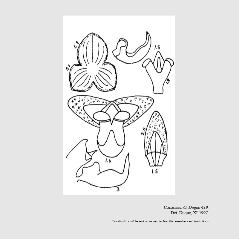 Found in Risaralda department of Colombia in cloud forests at elevations around 2100 meters as a small sized, cold growing epiphyte with erect, proportionally stout ramicauls enveloped by 3 fibrous tubular sheaths and carrying a single, apical, erect, coriaceous, elliptical-oblong, subobtuse, tridenticulate, cuneate below into the petiolate base leaf that blooms in the fall on an erect, distichous, laxly to densely, 3.2 to 6" [8 to 15 cm] long including the .72" [1.8 cm] long peduncle, successively several, many flowered inflorescence arising through a cucullate spathe with large, infundibular-cucullate floral bracts.