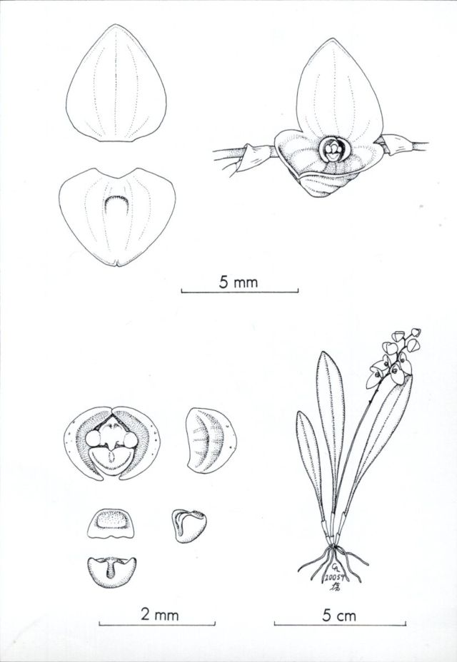Found in Morona-Santiago, Napo, Tungurahua and Zamora-Chinchipe provinces of Ecuador at elevations around 650 to 1700 meters as a small sized, warm to cool growing, caespitose epiphyte with erect, slender ramicauls enveloped by 2 close tublar sheaths and carrying a single, erect, coriaceous, narrowly elliptical, acute to subacute, narrowly cuneate below into the petiolate base leaf that blooms in the summer and fall on an erect to suberect, peduncle 1.2 to 1.6" [3 to 4 cm] long, arising through an annulus below the apex of the ramicaul, with an insignificant spathe, rachis 1.2 to 3.6" [3 to 9 cm] long, loose, successively 3 to 4, several flowered inflorescence with oblique, inflated, as long as the ovary floral bract and carrying flowers with transluscent purple, glabrous sepals, green, semilunate petals and a green lip.
