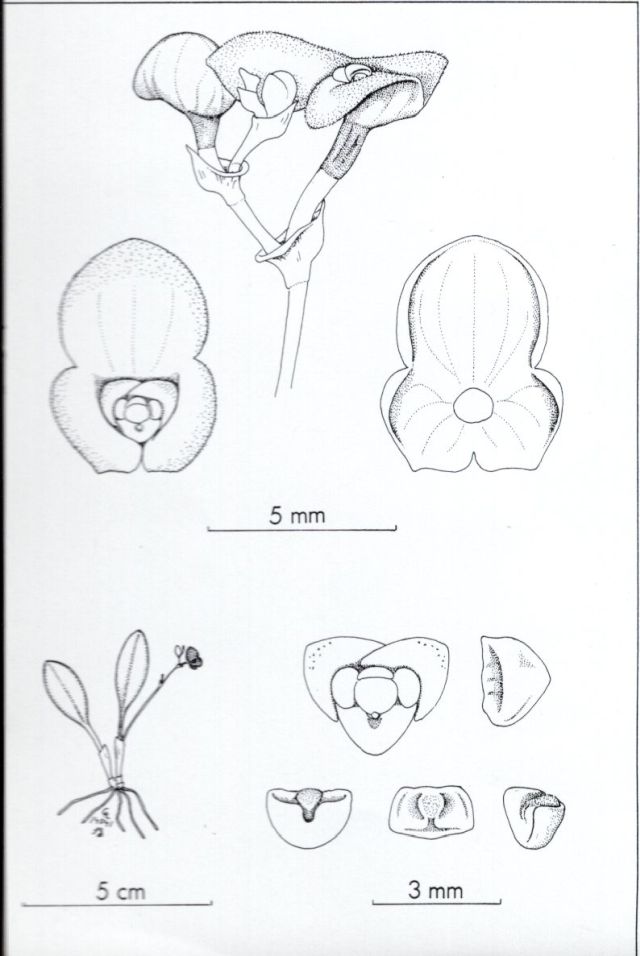 "The species is distinguished by the short habit with a loose, successively flowered raceme that eventually surpasses the elliptical leaves in length. The sepals are convex with revolute margins. The dorsal seepalis orbicular and more deeply connate to the half as large laterals than they are to themselves. The petals are semi-lunate and the lip is shortly oblong with a callus on the dorsum." Luer 2002