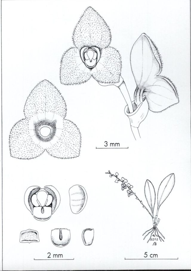 "The species is distinguished by the small, caespitise habit with a several flowered raceme that surpasses the elliptical leaves in length. The floral bracts are inflated, the sepals are ovate, obtuse, more or less equal and covered within by a dense pubescence and the petals are thin and concave. The lip is thickly discoid with a minutly pubescent, shallow dorsum." Luer 2002