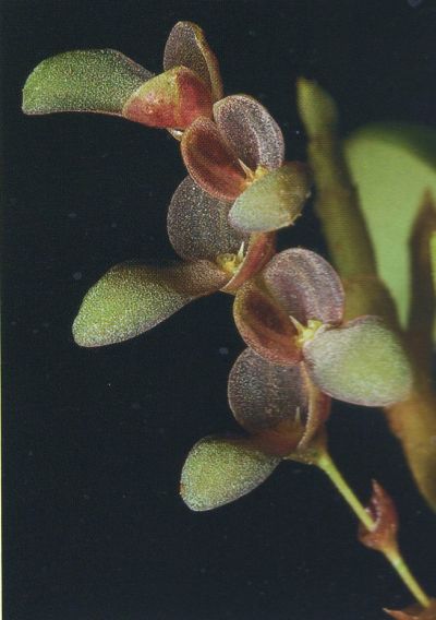 Found in Panama? and Ecuador at elevations around 1500 to 2500 meters as a mini-miniature sized, cool to cold growing epiphyte or terrestrial with ascending, slender ramicauls enveloped by 2 ribbed, tubular sheaths with minutely ciliate-papular margins and carrying a single, apical, suberect to pendent, coriaceous, elliptical, subacute to obtuse, cuneate below into the petiolate base leaf that blooms in the summer and early fall on a pendent, sublax, distichous, to 2 to 2.8" [5 to 7 cm] long including the .8 to 1.2" [2 to 3 cm] long peduncle, simultaneously several flowered inflorescence arising from near the apex of the ramicaul broadly ovate, cucullate, acuminate, acute floral bracts.