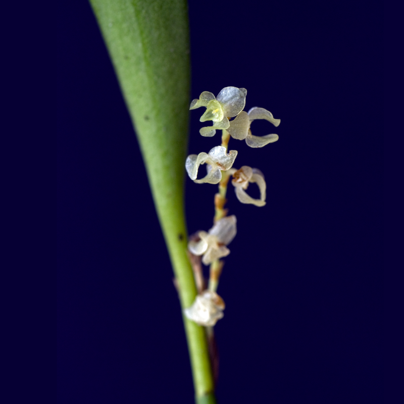 Found in northern Venezuela and Ecuador in montane cloud forests at elevations around 1300 to 1600 meters as a miniature sized, cool growing epiphtye with approximate, erect ramicauls enveloped by 2 to 3 tubular sheaths and carrying a single, apical, erect, spathulate, attenuate towards the base into the small, petiolate base leaf that blooms at most any time fo the year on a solitary, shorter than the leaf, 1.2 to 2.4" [3 to 6 cm] long including the .4" [1 cm] long peduncle, racemose, distichous, pauciflorus almost down to the base inflorescence arising through a small, acuminate spathe and has cucullate, shortly apiculate floral bracts.