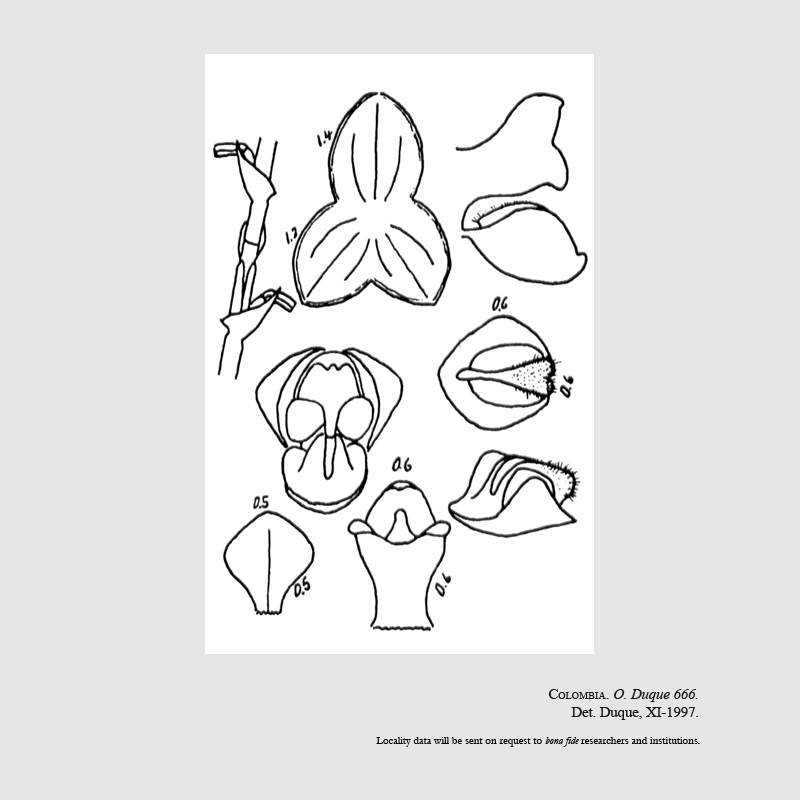 References W3 Tropicos, Kew Monocot list , *Orquideología Vol 20 #3 pg 356, 364–365, 367, pl. 6, f. 7–9; pl. 13, f. 2 Duque 1997 photo/Drawing fide; Orchidaceae Stelis Swartz A Compendium Duque 2008 drawing fide;