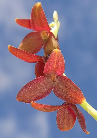 Found in southeastern Ecuador in rainforests at elevations around 1500 to 1900 meters as a small sized, warm to cool growing epiphyte with erect, stout ramicauls enveloped by 2, large, loose, tubular sheaths and another at the base and carrying a single, apical, erect, thickly coriaceous, narrowly elliptical, acute, cuneate below into the petiolate base leaf that blooms in the fall on a stout, rigidly erect, congested, secund, 6 to 12" [15 to 30 cm] long including the 1.6 to 4" [4 to 10 cm] long peduncle, mostly simultaneously many flowered inflorescence arising through a slender spathe at the base of the leaf with tubular floral bracts.