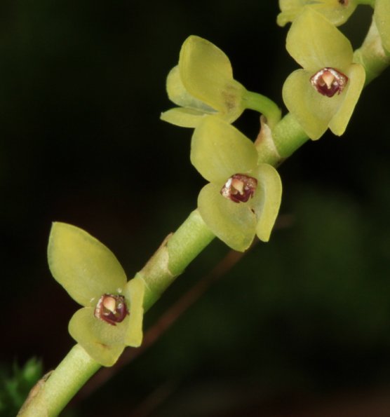 Found in Ecuador at elevations around 3400 meters as a miniature to small sized, cold growing epiphyte with erect, stout ramicauls enveloped by a 2 to 3, loose, tubular sheaths and carrying a single, apical, erect, coriaceous, elliptical, subacute, cuneate below into the petiolate base leaf that blooms in the late summer and early fall on an erect, congested, secund, 10 to 15.2" [25 to 38 cm] long including the 4" [10 cm] long peduncle, mostly suimultaneously many flowered inflorescence arising through a spathe from an annulus below the apex of the ramicaul with oblique, acute floral bracts .