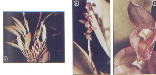 Found in Valle De Cauca department of Colombia at elevations around 1800 meters as a miniature sized, cool growing epiphyte with erect, stout ramicauls enveloped by a long tubular sheath in the upper third and 2 others at the base and carrying a single, apical, erect, coriaceous, elliptical, obtuse, tridenticulate, cuneate below into the petiolate base leaf that blooms in the late fall and early winter on an erect, loose, 3.6" [9 cm] long including the .8" [2 cm] long peduncle, mostly simultaneously many flowered inflorescence arising through a spathe at the base of the leaf with infundibular floral bracts.