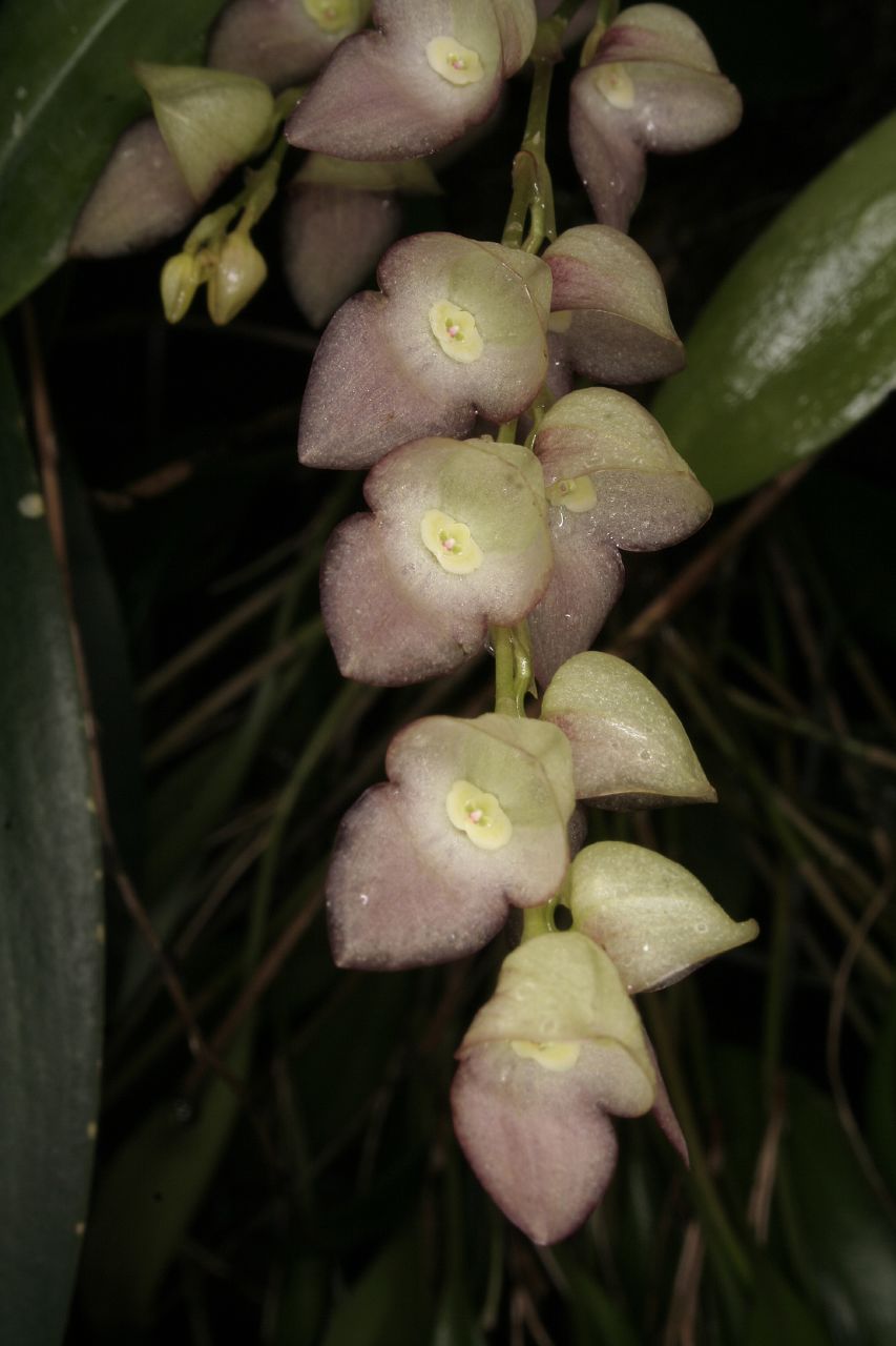 Found in Loja Ecuador at elevations around 2600 meters as a small to medium sized, cool to cold growing epiphyte with erect, slender ramicauls enveloped below by 2 shorter, loose, tubular sheaths and another larger in the upper half and carrying a single, apical, erect, coriaceous, elliptical, subacute to acute, cuneate below into the petiolate base leaf that blooms in the winter on an erect, loose, distichous, 4.8" [12 cm] long including the 1.6" [4 cm] long peduncle, successively single, several flowered, racemose inflorescence arising through a spathe from an annulus below the apex of the ramicaul with oblique acute floral bracts.