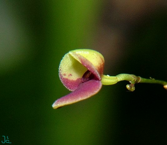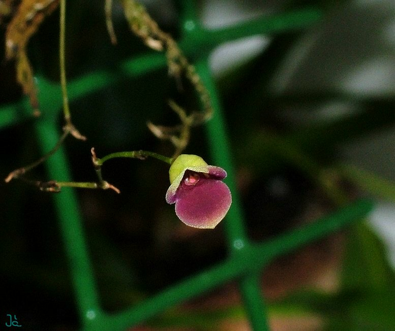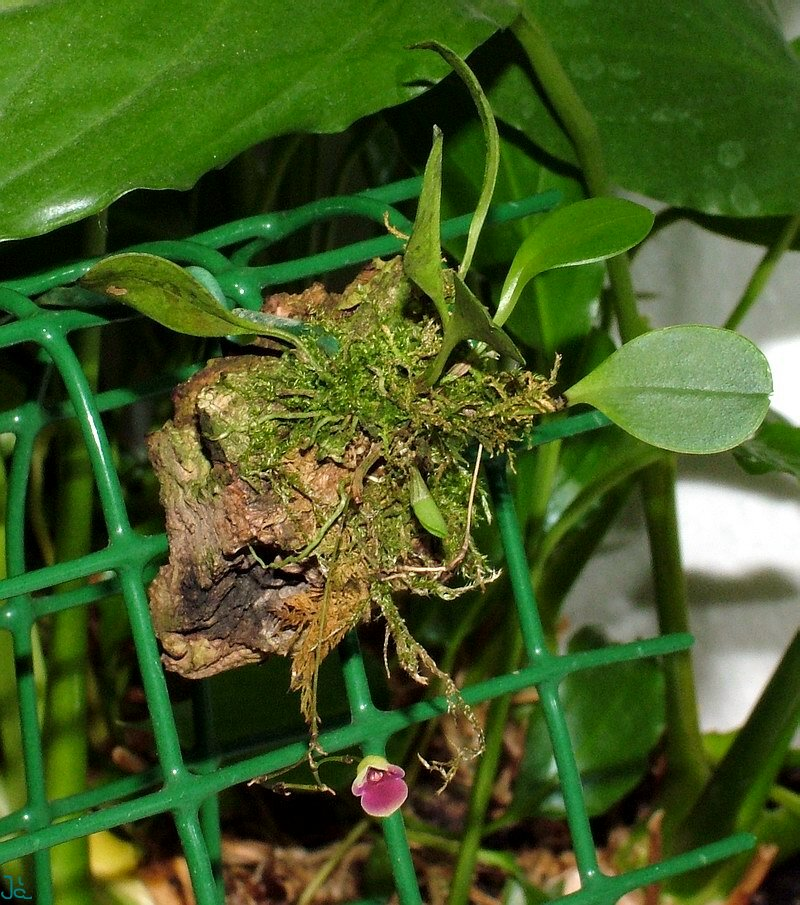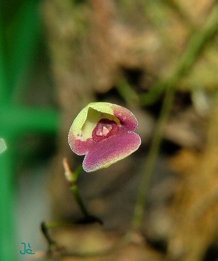 Found in Ecuador at elevations of 950 to 1300 meters as a mini-miniature sized, warm to cool growing epiphyte with slender, erect ramicauls enveloped basally by a tubular shaeth and another above and carrying a single, apical, erect, coriaceous, broadly elliptical, obtuse, cuneate below into the petiolate base leaf that blooms in the winter and spring on a suberect, lax, 2 to 2.8" [5 to 7 cm] long including the 1 to 1.2" [2.5 to 3 cm] successively few, single flowered inflorescence arising through an annulus below the apex of the ramicaul and has oblique, acute floral bracts.