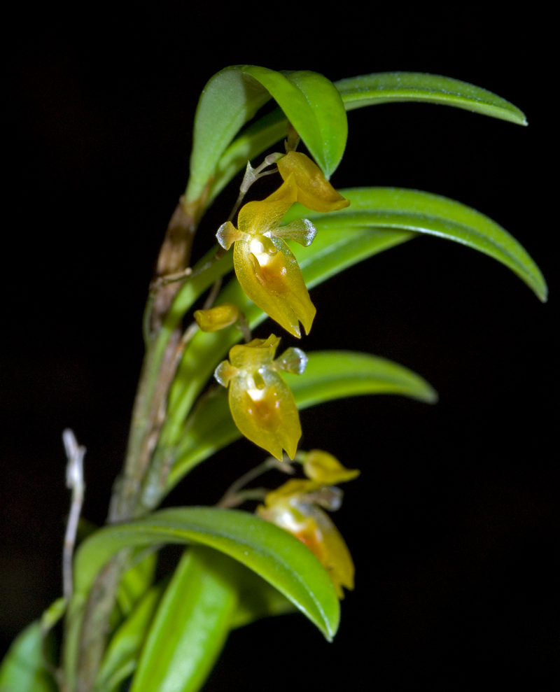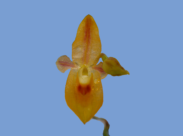 Found in Colombia, Ecuador and Peru in very wet, montane cloud forests at elevations of 1800 to 3200 meters as a small sized, cool to cold growing epiphyte with a stout, ascending-erect ramicauls enveloped by 2 to 3 loose, tubular sheaths and carrying a single, apical, erect, thickly coriaceous, narrowly elliptical, acute to subacute, narrowing below into the ill-defined petiolate base leaf that blooms in the spring through fall on 1 to 3, slender, 2" [5 cm] long, loose, successively single, few flowered inflorescence.