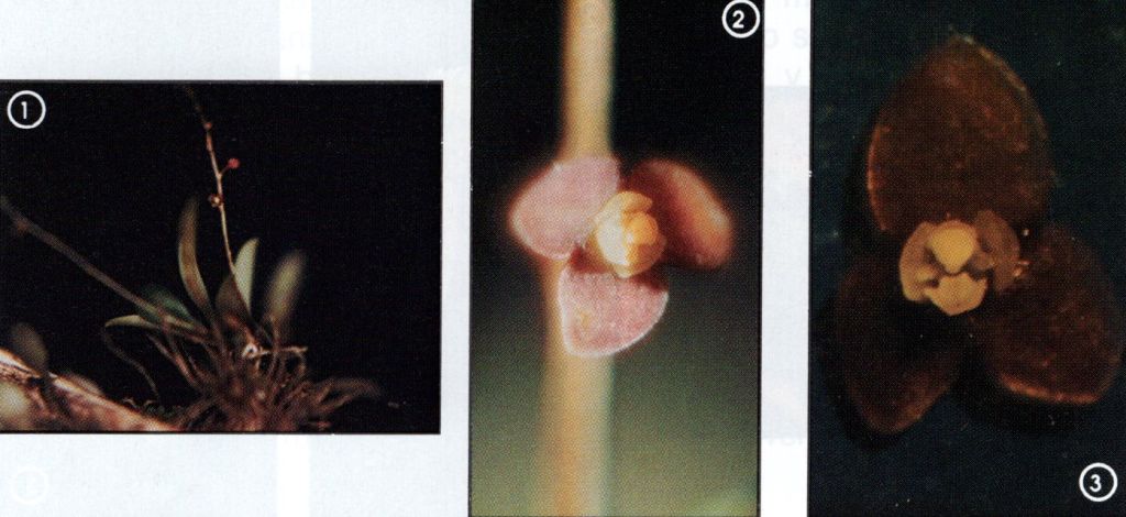 Found in Antioquia department of Colombia in cloud forests at elevations around 1800 meters as a mini-miniature sized, cool growing epiphtye with stout, crowded, erect, slender, ramicauls enveloped by 2 loose, tubular sheaths and carrying a single, apical, erect, coriaceous, elliptical-oblong, obtuse, tridenticulate, cuneate below into petiolate base leaf that blooms in the fall on an erect, slender, subdistichous, laxly, 2" [5 cm] long including the 1" [2.5 cm] long peduncle, few flowered inflorecence arising through an indistinct spathe with small, cucullate, obtuse bracts that are shorter than the pedicel.