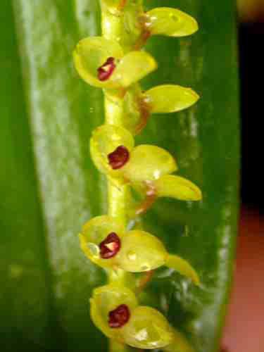 Found in Venezuela, Colombia, Ecuador and Peru at elevations of 2000 to 3000 meters as a small sized, cool to cold growing epiphyte or terrestrial with slender ramicauls enveloped by 2 to 4, tubular sheaths and carrying a single, apical, coriaceous, erect, elliptic-oblong, subacute to obtuse, tridenticulate apically, gradually narrowing below into the channeled petiolate base leaf that blooms in the spring on 2 to several, fasciculate, 2.4 to 8" [6 to 20 cm] long including the very short peduncle, distichous to subsecund, laxly to densely, mostly simultaneously many flowered, racemose inflorescence arising through a spathe from an annulus below the apex of the ramicaul with cuculate-acuminate floral bracts.