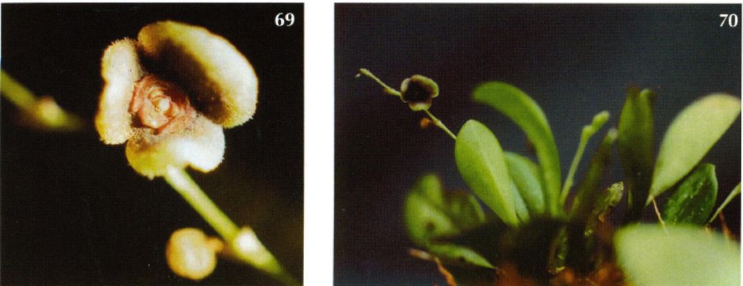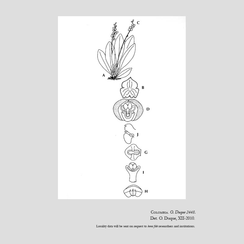 Found in Risaralda Colombia in upper humid forests as a mini-miniature sized, cold growing epiphtye with erect ramicauls enveloped by 3 close, tubular sheaths and carrying a single, apical, erect, coriaceous, elliptical-oblong, obtuse and tridenticulate, cuneate below into the petiolate base leaf that blooms in the spring on an erect, very congested, secund, to 1.04 to 1.4" [2.6 to 3.5 cm] long including the .4 to .6" [1 to 1.5 cm] long peduncle, successively 1 to 3, few flowered inflorecence arising through a spathe with oblique, acute floral bracts.