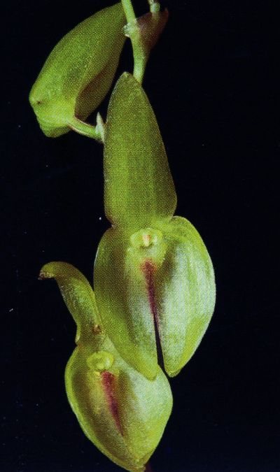 Found in Zamora-Chinchipe Ecuador at elevations around 1200 meters as a miniature sized, cool growing epiphyte with erect, slender ramicauls enveloped by a tubular sheath below the middle and 2 sheaths at the base and carrying a single, apical, erect, coriaceous, elliptical, subacute, cuneate below into the petiolate base leaf that blooms in the early summer on an erect, loose, distichous, to 7.2" [to 18 cm] long including the 2.4 to 2.8" [6 to 7 cm] long peduncle, simultaneously several, many flowered inflorecence arising through a thin spathe from an annulus below the apex of the ramicaul with infundibular, oblique, acute floral bracts.