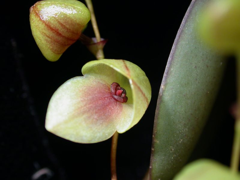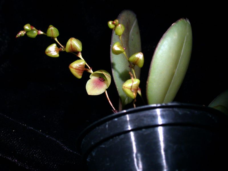 Found in Zamora-Chinchipe Ecuador near the Peruvian Border with erect, stout ramicauls enveloped by 2 loose, tubualr sheaths and carrying a single, apical, erect, thickly coriaceous, broadly elliptical, rounded apically, rounded below into the abrupt petiolate base leaf and blooms in the winter on an erect, loose, 2.4 to 3.2" [6 to 8 cm] long including the .8 to 1 [2 to 2.5 cm] long peduncle, successively 3 to 4, several flowered inflorescence arising from an annulus at the apex of the ramicaul, with tubular, oblique floral bracts