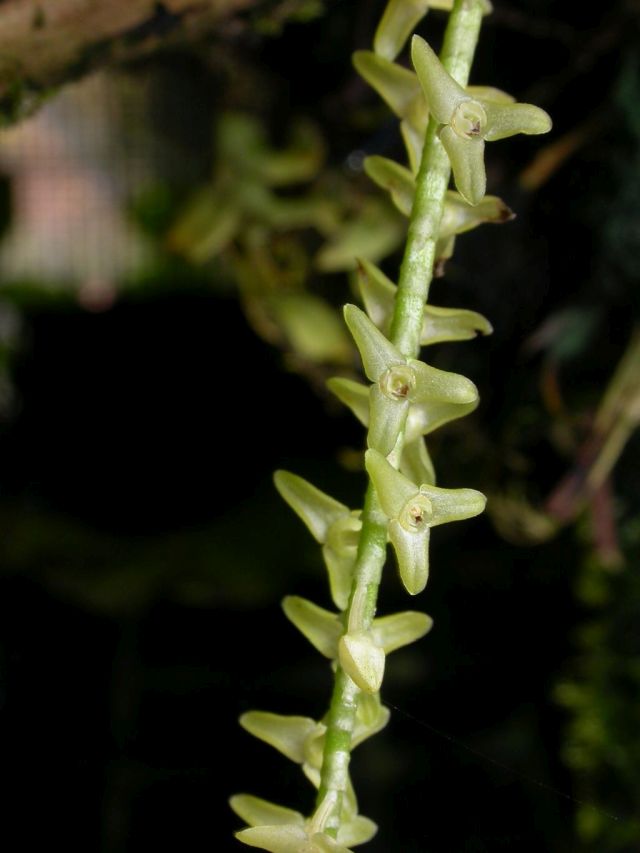 Found in Ecuador at elevations of 600 to 1700 meters as a miniature sized, hot to cool growing epiphyte with erect, slender ramicauls enveloped basally by 2 loose, tubular sheaths and another below the middle and carrying a single, apical, erect, coriaceous, elliptical, subacte to obtuse, cuneate below into the base leaf that blooms in the summer on an erect, distichous, racemose, 4 3/4 to 8 3/4" [12 to 22 cm] long including the 1.2 to 2.8” ,3 to 7 cm] long peduncle, densely and nearly simultaneously many flowered inflorescence arising through a spathe from an annulus at the leaf base and carrying short, broad floral bracts.
