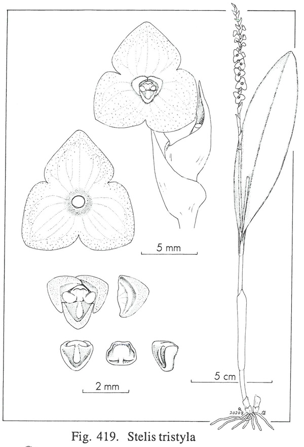 References W3 Tropicos, Kew Monocot list , IPNI ; Flora de Venezuela Volumen XV Parte 2 Foldats 1970 drawing good; Orchidaceae Brasilense Band 1 Pabst & Dungs 1975 drawing ok; Orchids of Venezuela, An Illustrated Field Guide Vol 3 Dunsterville & Garay 1979 as S grossilabris not drawing fide; Orchids of Venezuela, An Illustrated Field Guide Vol 3 Dunsterville & Garay 1979 as S zonata not = drawing fide; Orquideas de Bolivia Vol 1 Vasquez & Ibisch 2000 as S casanaensis; Orquideas de Bolivia Vol 1 Vasquez & Ibisch 2000 as S trianguliflora; Flora of the Venezuelan Guayana Vol 7 Steyermark, Berry, Yatskievych and Holst 2003 drawing ok; Native Ecuadorian Orchids Vol 5 Dodson 2004 photo hmm; Orchidaceae Stelis Swartz , A Compendium Duque 2008 drawing fide; Icones Pleurothallidinarum Vol XXX Luer 2009 drawing fide