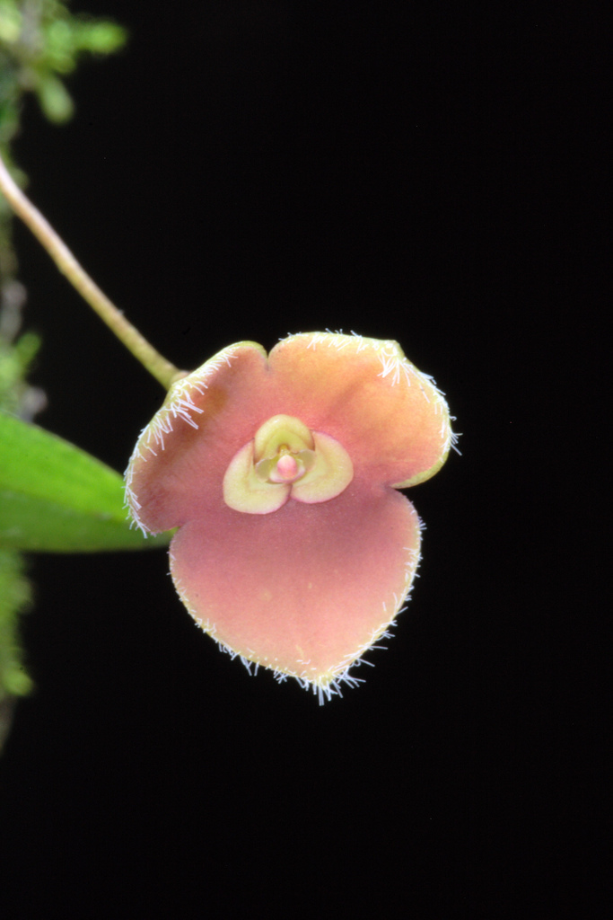 Found in Morona-Santiago Ecuador at elevations around 1500 meters as a mini-miniature sized, cool growing epiphyte with erect, stout ramicauls enveloped by 2 tubular sheaths and carrying a single, apical, erect, coriaceous, elliptical, subacute, cuneate below into the petiolate base leaf that blooms in the early summer on an erect, .8 to 1.2" [2 to 3 cm] long including the .6" [1.5 cm] long peduncle, single flowered inflorescence arising from an annulus below the apex of the ramicaul with oblique, acute floral bracts.