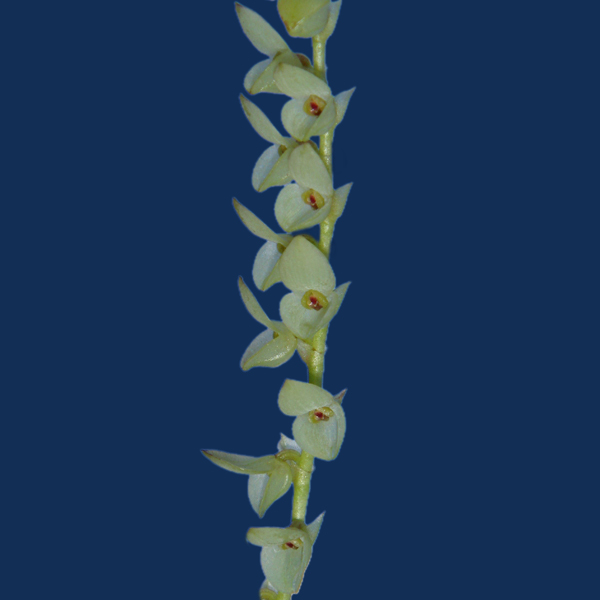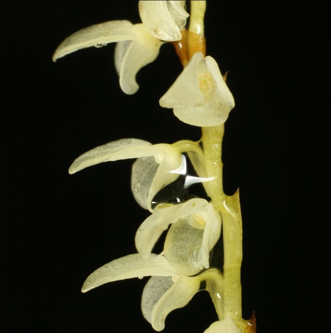 Found in Venezuela, Colombia, Ecuador and Peru in cloud forests at elevations around 2800 meters as a small sized, cold growing epiphyte or occasional lithophyte with ramicauls enveloped by 2 to 3 tubular sheaths and carrying a single, apical, erect, elliptic-oblong, coriaceous, subacute, tridenticulate apically, narrowing below into the petiolate base leaf that blooms in the late summer through early winter on an erect, on 1 to 2, erect, to 7.2" [18 cm] long including the 2 to 3.2" [5 to 8 cm] long pecduncle, subdistichous, subdense, many flowered inflorescence arising through a spathe from an annulus below the apex of the ramicaul with tubular, acute floral bracts