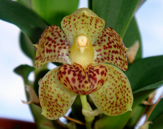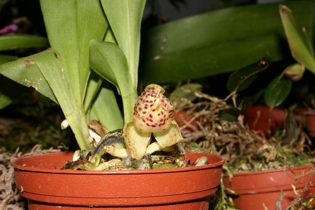 Found in Peru and Ecuador in very wet montane cloud forests at 1200 to 2200 meters as a small sized, warm to cool growing epiphytic, fan-shaped orchid with a very short, clustered leafy stem carrying distichous, thin, oblanceolate to obovate, acute or acuminate, grey-green leaves and blooms in the winter and spring on a arcuate to suberect, axillary, slender inflorescence with a single flower and hyaline, ovate-cucllate floral bracts.