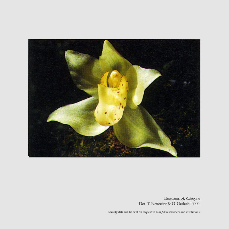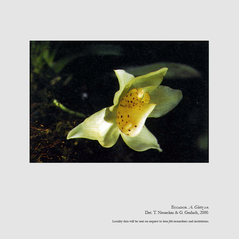 References W3 Tropicos, Kew Monocot list , IPNI ; Lankester's Epidendra Website CR ; *Orquideología Vol 21 #3 pg 259. 2000 drawing/photo fide; Rudolf Schlechter Die Orchideen Band 1C lieferung 44-45 pg 2763 - 2898 Brieger 2001; Huntleya and Related Orchids Harding 2008