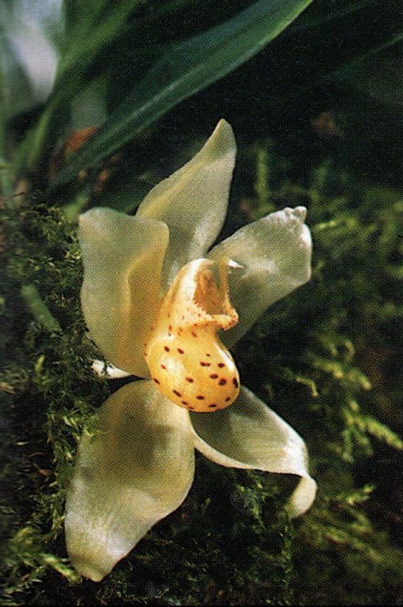Found in Ecuador at elevations of 800 meters as a miniature to small sized, hot to warm growing epiphyte with fan-shaped leaf clusters with narrow to broadly oblanceolate, abruptly acute at the obtuse apex, attenuate below into the conduplicate, petiolate base leaves that blooms on 1 to several successive, axillary, pendant, slender, terete, 1" [2.5 cm] long, single flowered inflorescence.