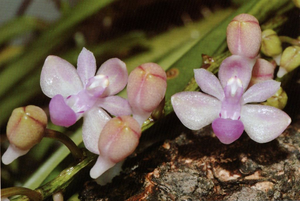 Found inYunnan province of China, Myanmar and Thailand in forests on trees at elevations around 1800 meters as a small sized, cool growing epiphyte with a stem carrying 2, ranked, oblong to linear leaves that blooms in the summer on a a lateral, 4 to 6" [10 to 15 cm] long, longer than the leaves, to 20 flowered inflorescence