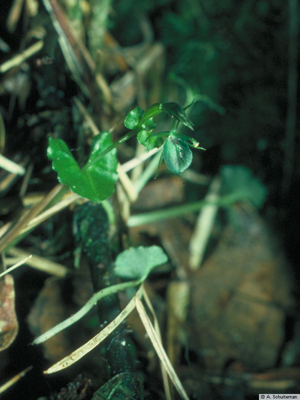 Found in New Guinea and the Solomon Islands in montane forests in deep shade at elevations of 2100 to 2700 meters as a miniature sized cool to cold grwoing terrestrial with an erect, 1" stem with a median, large deeply cordate scalloped edge, dark green leaf that blooms in the winter and summer with a terminal erect, single flowered inflorescence with a small leaf-liker, cordate bract at the short pedicel base of each flower.