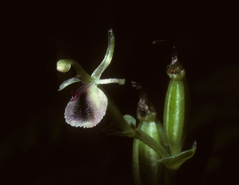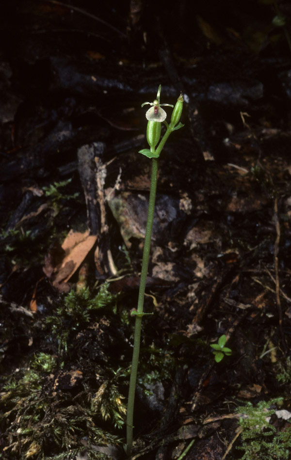 Found in Java at elevations around 1600 to 1700 meters as a mini-miniature to miniature sized, cold growing terrestrial with an erect, square in section, thin stem carrying a single,half way up the stem, heart-shaped, acuminate, sessile leaf and a similar leafy bract beneath each flower that blooms in the fall on an erect, 2 to 3 flowered inflorescence
