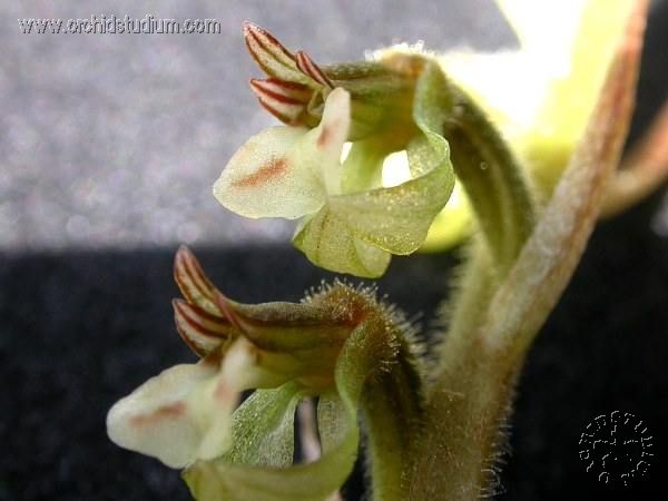 Found in southeastern Brazil to Missiones Argentina as a small sized, cool to cold growing terrestrial with a few, basal, oval-orbucular, green with a central white line and 2 white lines along the margins, rounded below into the pseudopetiolate base leaves that blooms on a 14 to 16" [35 to 50 cm] long overall, peduncel with 4 to 6, well spaced bracts, rachis 2.8 to 4" [7 to 10 cm] long, laxly, few flowered inflorescence and carrying spirally arranged, externally pubescent flowers.