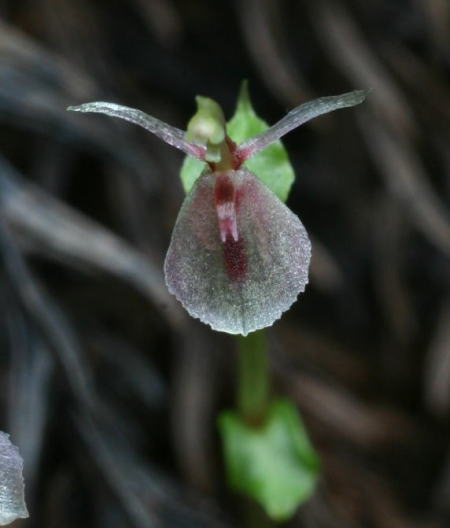 Found in Japan, Taiwan and Fujian and Hunan provinces of China along gullies in dense forests in deep shade at elevations around 1800 meters as a miniature sized, cold growing terrestrial with a small tuber giving rise to a erect, puberulent, cylindric subterranean portion of the stem carrying 1 to 2, small apical scales and the above ground portion is slender, angled and has a short cataphyl at the base and carrying a triangular-ovate, 3 veined, acuminate apically leaf midway up the stem that blooms in the later summer on a 1 t o3flowered inflroescence with pale green slightly smaller that he leaf floral bract.