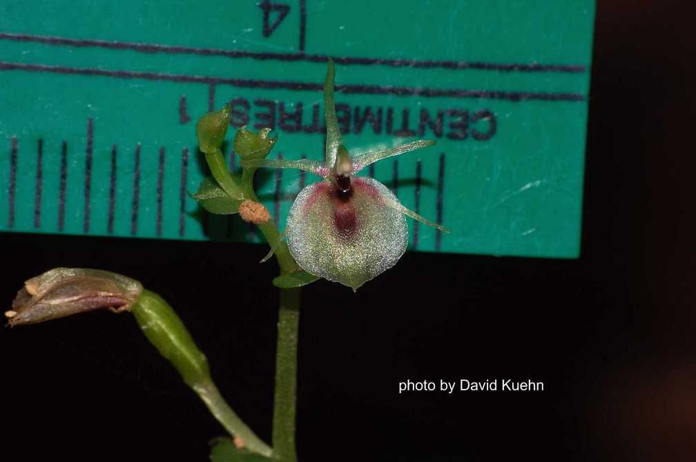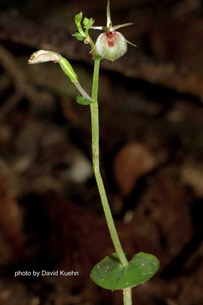 Found in penninsular Malaysia in Kedah at elevations around 1130 meters as a mini-miniature sized, cool growing terrestrial with a rhizomatous, densely hary rooted tuber giving rise to an erect, 4 angled stem enveloped basally by a cataphyl carrying a single, sessile, cordate, auriculate basally leaf that blooms in the fall on an erect, 4 angled, peduncle .66 to .92" [1.7 to 2.3 cm] long, rachis .6 to 1.68" [1.5 to 3.7 cm] long, 1.28 to 2.4" [3.2 to 6 cm] long overall, 1 to 2, successively 2 to 3 flowered inflorescence with a leaf-like, cordate, sessile, acuminate floral bract and carrying resupinate, widely opening flowers