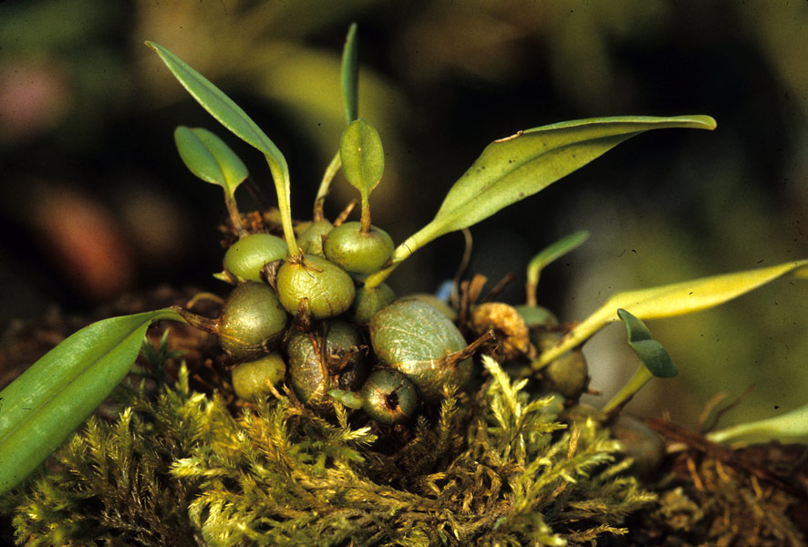 Found in southwestern Tanzania in montane forests at elevations of 1800 to 1950 meters as a mini-miniature sized, cold growing epiphyte with a creeping rhizome giving rise to globose, slighyl dorsiventrally compressed pseudobulbs enveloped by scarious sheaths in youth and carrying 1 to 2, apical, erect to suberect, subcoriaceous, oblong to oblanceolate, obtuse, gradually narrowing below into the sulcate, slender petiolate base leaves that blooms in the summer on a basal, to .4" [1 cm] long, single flowered inflorescence carrying fleshy, large for the genus, inflated flowers.