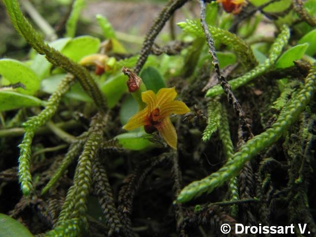 Found in Cameroon, the Gulf of Guinea Islands, Equatorial Guinea and Ethiopia at the edge of montane forests and swamp forests at elevations of 800 to 2850 meters as a miniature sized, cool to cold growing epiphyte with a creeping rhixome giving rise to slender, clavate, rhizomatous, rather wiry, swollen below each pair of leaves pseudobulbs carrying 2, apical, elliptic to obovate leaves that blooms in the fall winter and spring on a terminal, .12 to .32" [3 to 8 mm] long, single flowered inflorescence