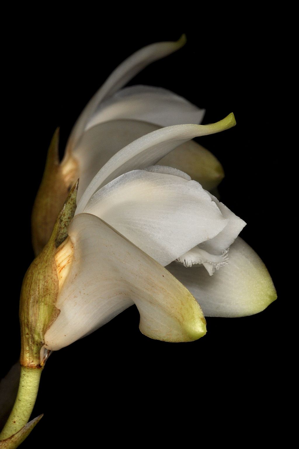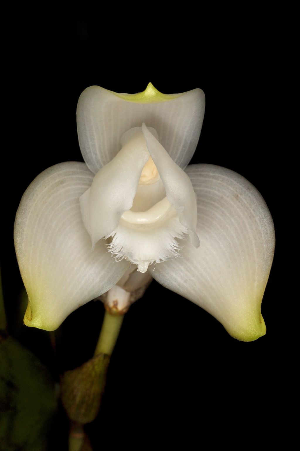 Found in Peru at elevations around 1700 to 2200 meters in light woodland as a large sized cool to cold terrestrial with tapering, conic, faintly ridged pseduobulbs without spines and carrying 3, plicate, drooping, lanceolate, leaves that blooms in the later spring on an erect, to 11.6" [29 cm] long, single flowered inflorescence with 3 completely to almost completely sheathing bracts