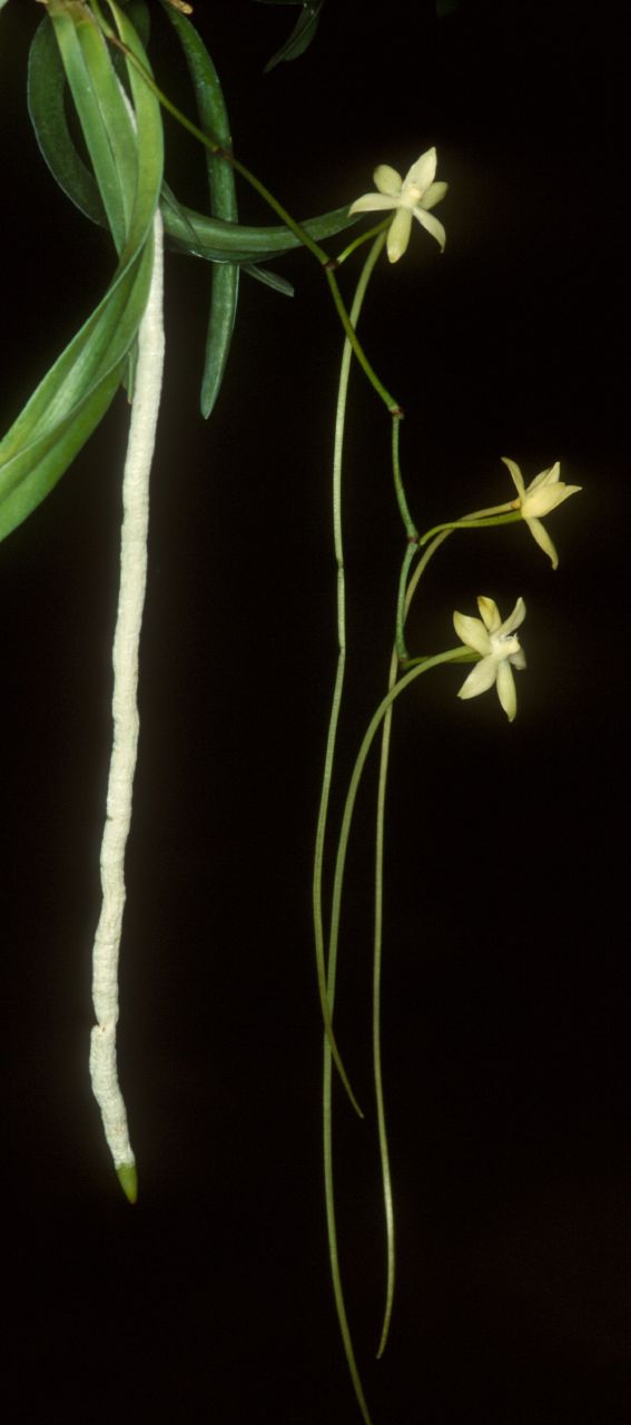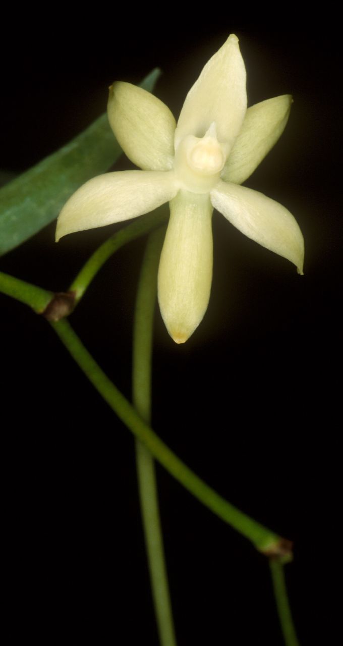 Found in Malawi, Tanzania, Zaire, Zambia and Zimbabwe in open woodlands with high rainfall and a long dry season at elevations of 600 to 700 meters as a miniature to small sized, warm to cool growing epiphyute or occasional lithophyte with a short stem carrying, 3 to 7, disitchous, linear, folded, recurved, thick, yellowish green leaves held in a fan that blooms in the fall on an axillary, from lower leaf axils, erecet to downward, 5 to 6" [12.5 to 15 cm] long, 4 to 5 flowered inflorescence with the terminal, fleshy, non-resupinate flower opening first