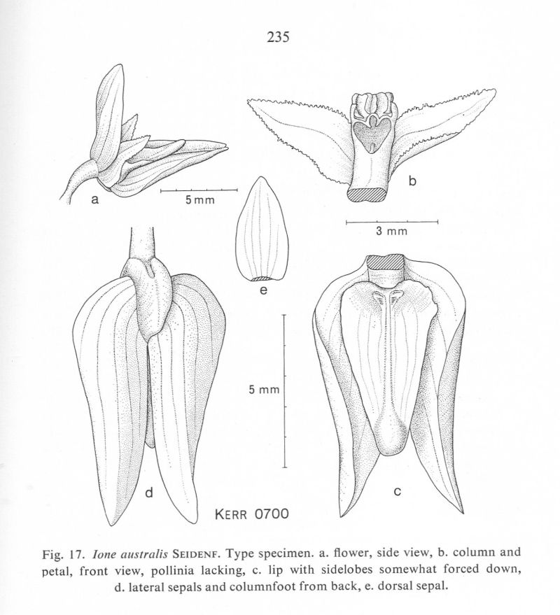 References W3 Tropicos, Kew Monocot list , IPNI ; The Orchids of Thailand Seidenfaden & Smitinand 1961 as Ione siamensis drawing fide; Botanisk Tidsskrift Bind 64 hefte 2-3 Notes on the Genus Ione Seidenfaden 1969 as Ione australis drawing fide; Die Orchideen lieferung 24 Schlechter/Brieger 1991 as Sunipia australephoto fide; Phytotaxa 166 (2): 101–113 J.J.Verm., Schuit. & de Vogel 2014