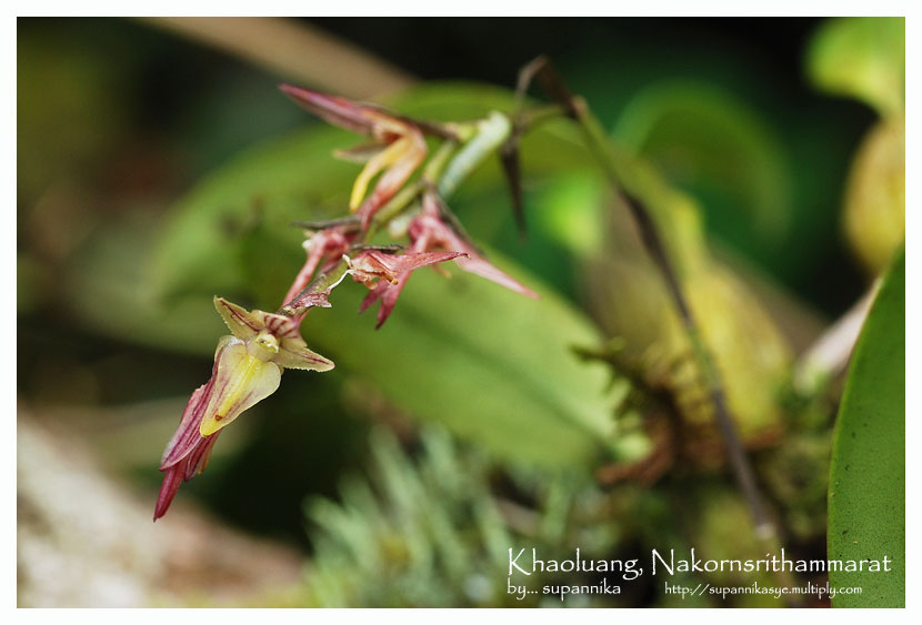 Found in pennisular Thailand at elevations around 1000 to 1200 meters as a mini-miniature to miniature sized, cool growing epiphyte with .8" [2 cm] between each pseudobulb carrying a single, apical, erect, short to .28 to .36" [7 to 9 mm] long, , somewhat petiolate base leaf that blooms on an erect, thin, to 10" [25 cm] long overall, with 5 to 6, closely enveloping sheaths, rachis 1.2 to 2" [3 to 5 cm] long, 8 to 12 flowered inflorescence with shorter than the flowers floral bracts.