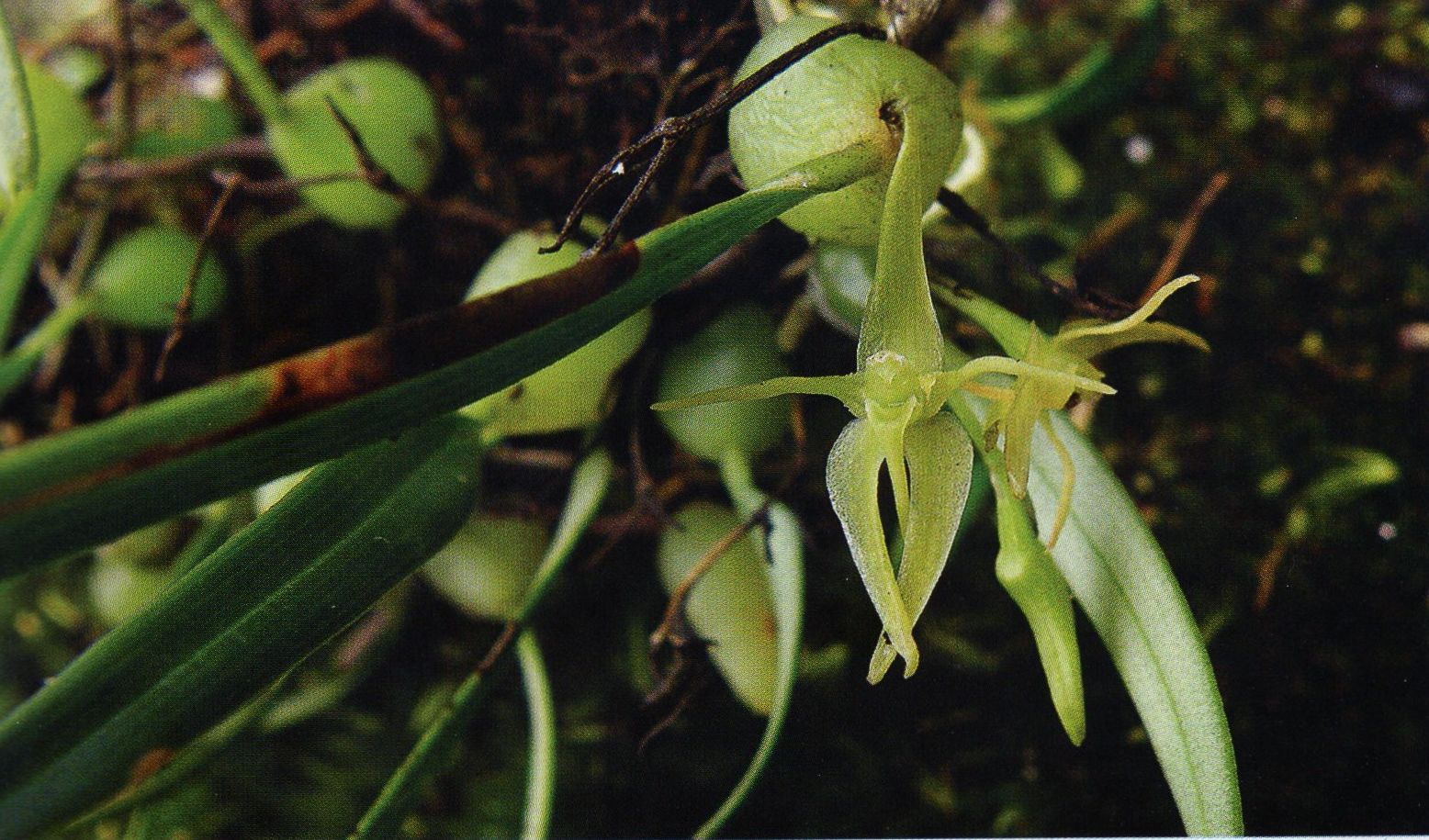 Found in southeastern Xizang province of China, Bhutan and Sikkim at elevations around 1800 meters as a miniature sized, cool growing epiphyte with 1/2" [1.25 cm] between each ovoid, semi-transparent pseudobulb and carrying a single, apical, erct, linear, notched apically, slightly narrowing below into the petiolate base leaf that blooms on a 3/4" [1.85 cm] long, zigzag, 1 to 2 flowered inflorescence enveloped below by 2 to 3 basal bracts and has lanceolate, equal to or longer than the ovary floral bracts.