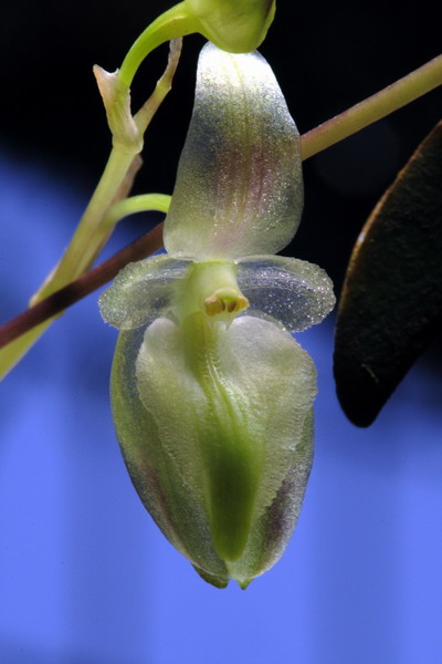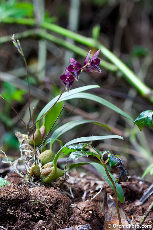 Found in Myanmar, Thailand and Yunnan provvince of China in forests on tree trunks at elevations around 1500 to 1750 meters as a miniature sized, cool growing epiphyte with .6" [1.5 cm] between each ovoid pseudobulb carrying a single, apcial, erect, oblong, leathery, contracted below into the petiolate base leaf that blooms in the fall on an erect, slender, 2 to 3.2" [5 to 8 cm] long, 2 to 3 flowered inflorescence with 2 to 3 sheaths and ovate-lanceolate, membraneous, acute floral bracts.