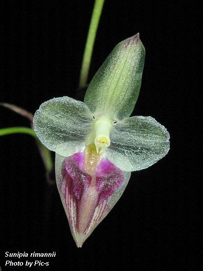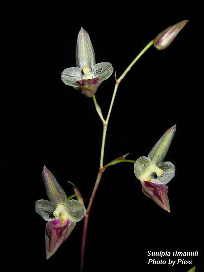 References W3 Tropicos, Kew Monocot list , IPNI ; Die Orchideen Schlechter 1915 as Monomeria rimanii; Botanisk Tidsskrift Bind 64 hefte 2-3 Notes on the Genus Ione Seidenfaden 1969 as Ione salweenensis drawing fide; Bulbophyllum and Their Allies Seigerist 2001 as Ione rimannii; A Field Guide to the The Wild Orchids of Thailand Vaddhanaphuti 2001 as Sunipia rimannii photo ok; A field Guide to the Wild Orchids of Thailand Vaddhanaphuti 2005 as Sunipia rimannii photo ok; Orchids of India A Glimpse Misra 2007 as Sunipia rimannii ; Flora of China Vol 25 Zhengyi, Raven & Deyuan 2009; Flora of China Vol 25 Zhengyi, Raven & Deyuan 2010 as Sunipia rimannii drawing fide to the 1st photo; Turczaninowia 16(4):26-46 NEW AND RARE ORCHIDS (ORCHIDACEAE) IN THE FLORA OF CAMBODIA AND LAOS Averyanov 2013 as Sunipia rimanii photo fide; Orchid Digest Vol 78 #2 2014 photo ok; Phytotaxa 166 (2): 101–113 J.J.Verm., Schuit. & de Vogel 2014; Atlas of Native Orchids of China Vol 2 Jin Xiaohua, Li Jianwu and Ye Deping 2019 photo hmm;