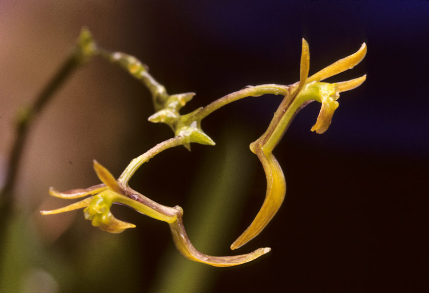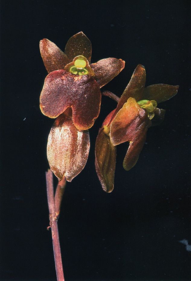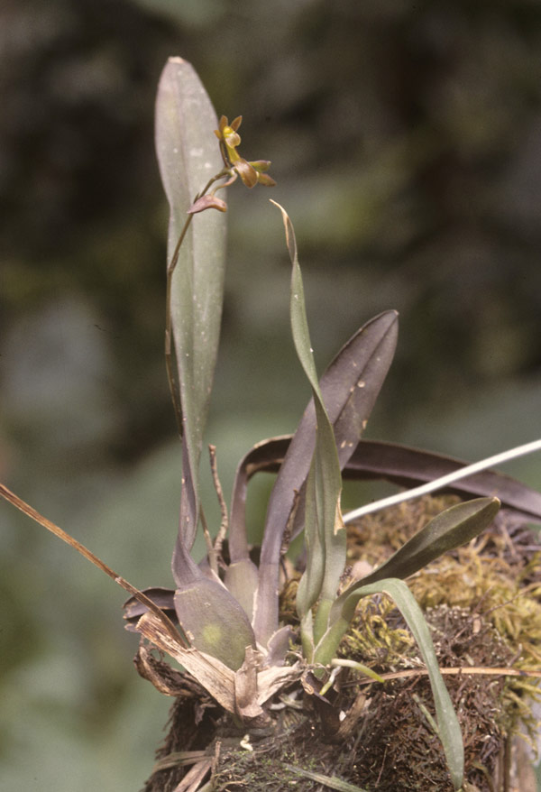 Found in Junin Peru at elevations around 1000 meters as a small sized, warm growing epiphyte with clustered, egg-shaped pseudobulb enveloped by 2 pairs of distichous, overlapping leaf braing sheaths and carrying a single, leathery, longitudinally conduplicate, oblong-lanceolate to elliptic-oblong, acute leaf that blooms in the spring on a basal, longer thaqn the leaf, to 10" [25 cm] long, rachis short, to 9 flowered inflorescence arising on a newly matured pseudobulb
