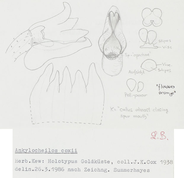 References W3 Tropicos, Kew Monocot list , IPNI ; Die Orchideen Band 1B lieferung 23 1393 - 1456 Brieger 1990 drawing fide; Flora Zambesiaca Vol 11 Orchidaceae Part 2 Orchidaceae Pope 1998 drawing fide; Genera Orchidacearum Vol 6 Epidendroideae pt 3 Pridgeon, Cribb, Chase and Rasmussen 2014 as Ankylocheilos coxii; Genera Orchidacearum Vol 6 Epidendroideae pt 3 Pridgeon, Cribb, Chase and Rasmussen 2014 drawing good