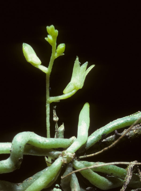 Found in west Java in damp forests at elevations around 1200 meters as a miniature to small sized, cool growing epiphyte without leaves that blooms in the fall on a thin peduncle, 1.2" [3 cm] long overall, many flowered inflorescence.