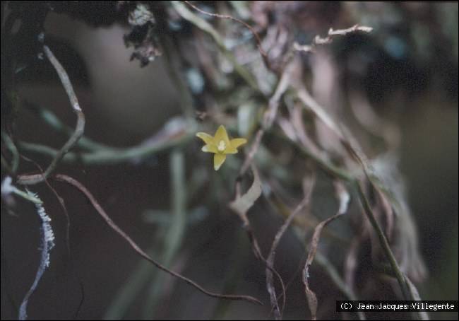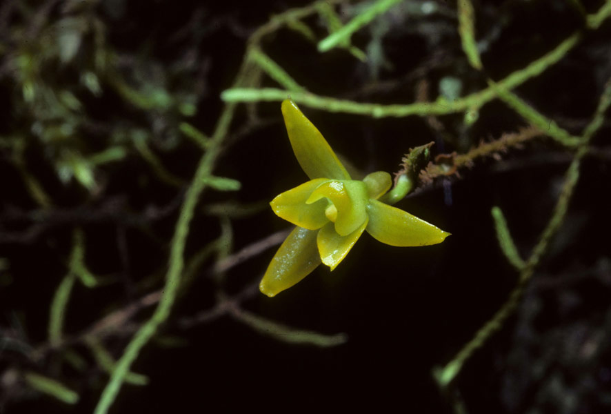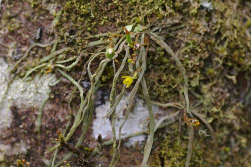 Found in Java and northern Borneo in lower montane forests at elevations around 1300 to 1900 meters as a cool growing epiphyte with numerous, grey, somewhat flattened roots that blooms in the winter on a bristley, 1.6 to 2" [3 to 5 cm] long, successively single flowered inflorescence carrying 6 to 15 mostly yellow but some with green flowers