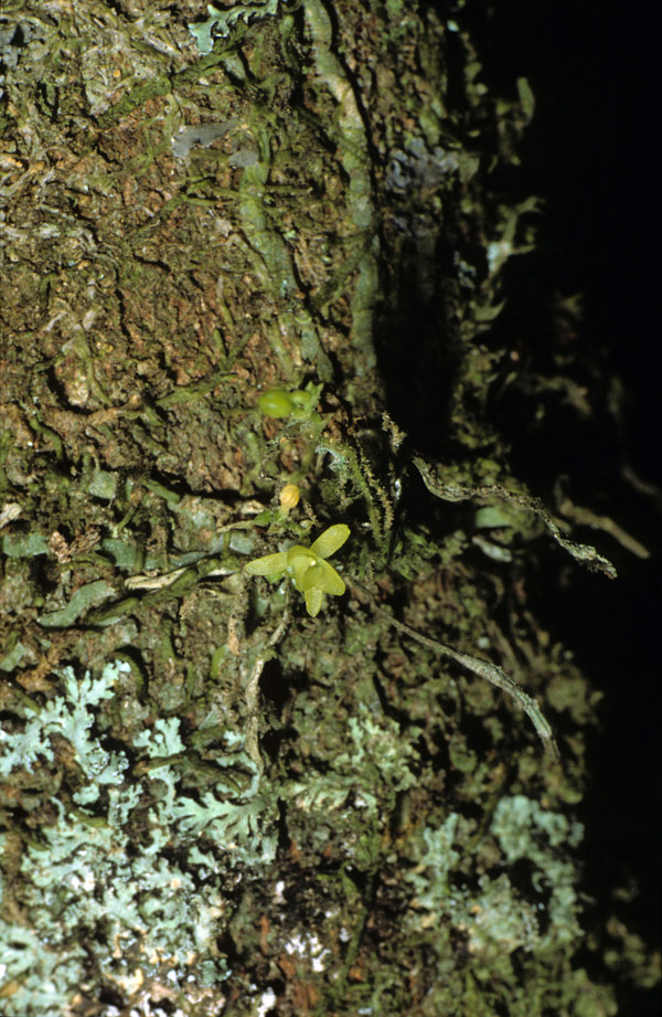 Found in northern Queensland Australia in rainforests on twigs or trees at elevations of 400 to 1250 meters as a small to large sized, hot to cool growing epiphtye with numerous, flattened, pale green to grey green roots that blooms in the winter through spring on a horizontal, long white pubescent, .2 to .6" [ .5 to 1.5 cm], usually 2 flowered inflorescence with only one flower open at a time.