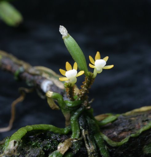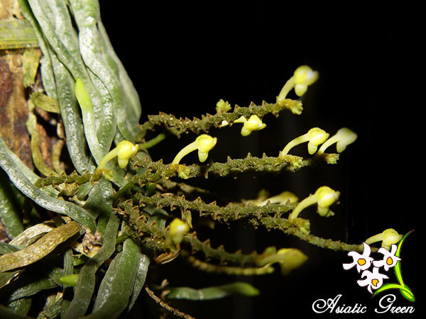 Found in south-central China, Malaysia, Cambodia, Thailand, Borneo, Java, Sumatra and Vietnam in swampy primary montane forests on mangrove and coffee plants at elevations of 150 to 1600 meters as a small sized, hot to warm growing epiphyte with creeping, radiating, flattened roots that blooms on a sessile, .4" [1 cm] long, fractiflex rachis, brown-green,covered with tuburcles many successively flowered inflorescence with two ranked, triangular, acute, very concave, warty floral bracts carrying thin, wide open flowers.