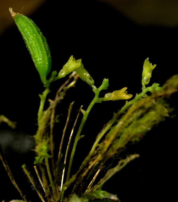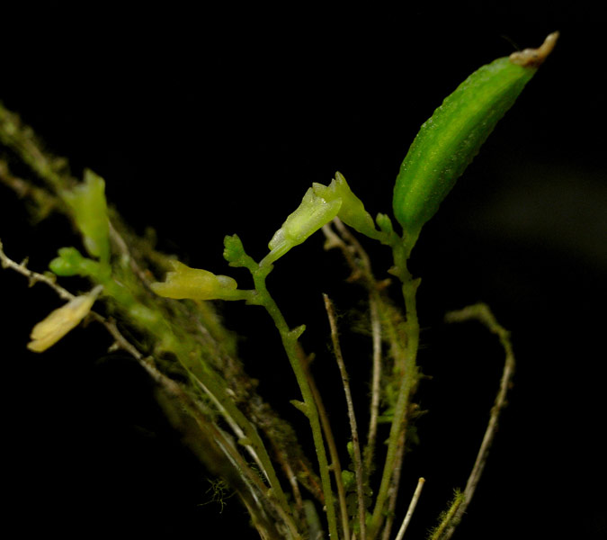 Found in the Thailand, penninsular Malaysia and Vietnam in lowland primary forests at elevations around 400 meters as a miniature sized, hot growing epiphyte with triangular in section, slender roots and giving rise to no leaves that blooms in the spring on a rough, erect , 1" [2.5 cm] long, successively several flowered inforescence carrying pale greenish flowers that barely open.