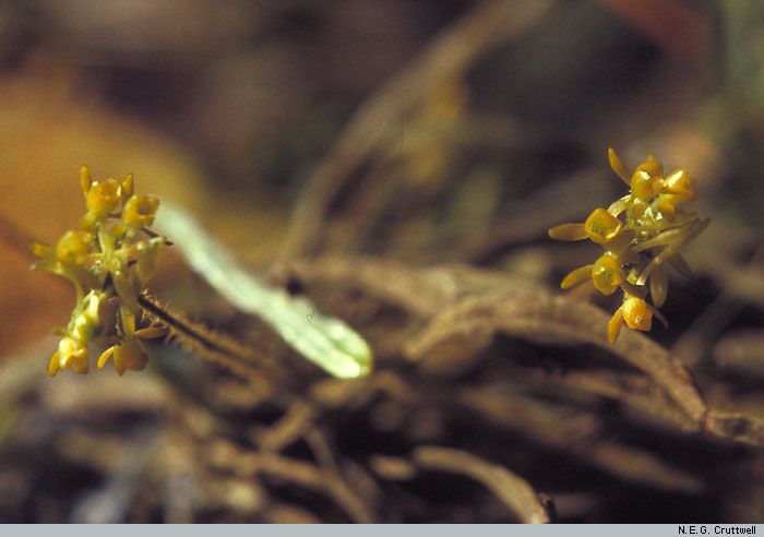 Found in New Guinea in montane forests at elevations of 1500 to 3100 meters as a medium sized, cool to cold growing leafless epiphyte with strongly flattened, flexuous, to 20" [to 50 cm] long roots radiating from a central nexus and blooming at most any time of the year on an erect, racemose, to 12" [to 30 cm] long, very densely muricate-villose, densely 10 to 20 flowered inflorescence with glabrous, facing in all directions flowers.