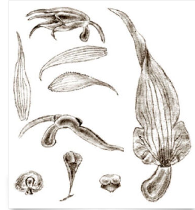 Found in Papua New Guinea in lowland forest at elevations around 25 meters as a small sized, hot growing epiphyte with a very short leafless stem enveloped in adpressed fibers giving rise to creeping, linear, to 10" [25 cm] long roots that blooms in the spring on an erect, peduncle filiform, angular, furfuraceous-punctate, provided with c. 4 very small peduncle-scales, rachis flexuose, quadrangular, furfuraceous-punctate, .96" [2.4 cm] long, single flowered inflorescence with distichous, patent, triangular, conduplicate-concave, keeled, with the laterally flattened, acute keel overtopping the apex, furfuraceous-punctate floral bracts and carrying light yellow colored flowers.