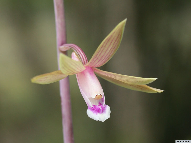 Found in Myanmar, Thailand, Laos, Yunnan province of China and Vietnam on stony, humus rich soils in sparse woods at elevations of 500 to 1300 meters as a miniature to small sized warm to cool growing epiphyte with a chain of underground, globose to ellipsoid tubers giving rise to an erect, to 12" [30 cm] long, few flowered inflorescence occuring in the late summer and fall.